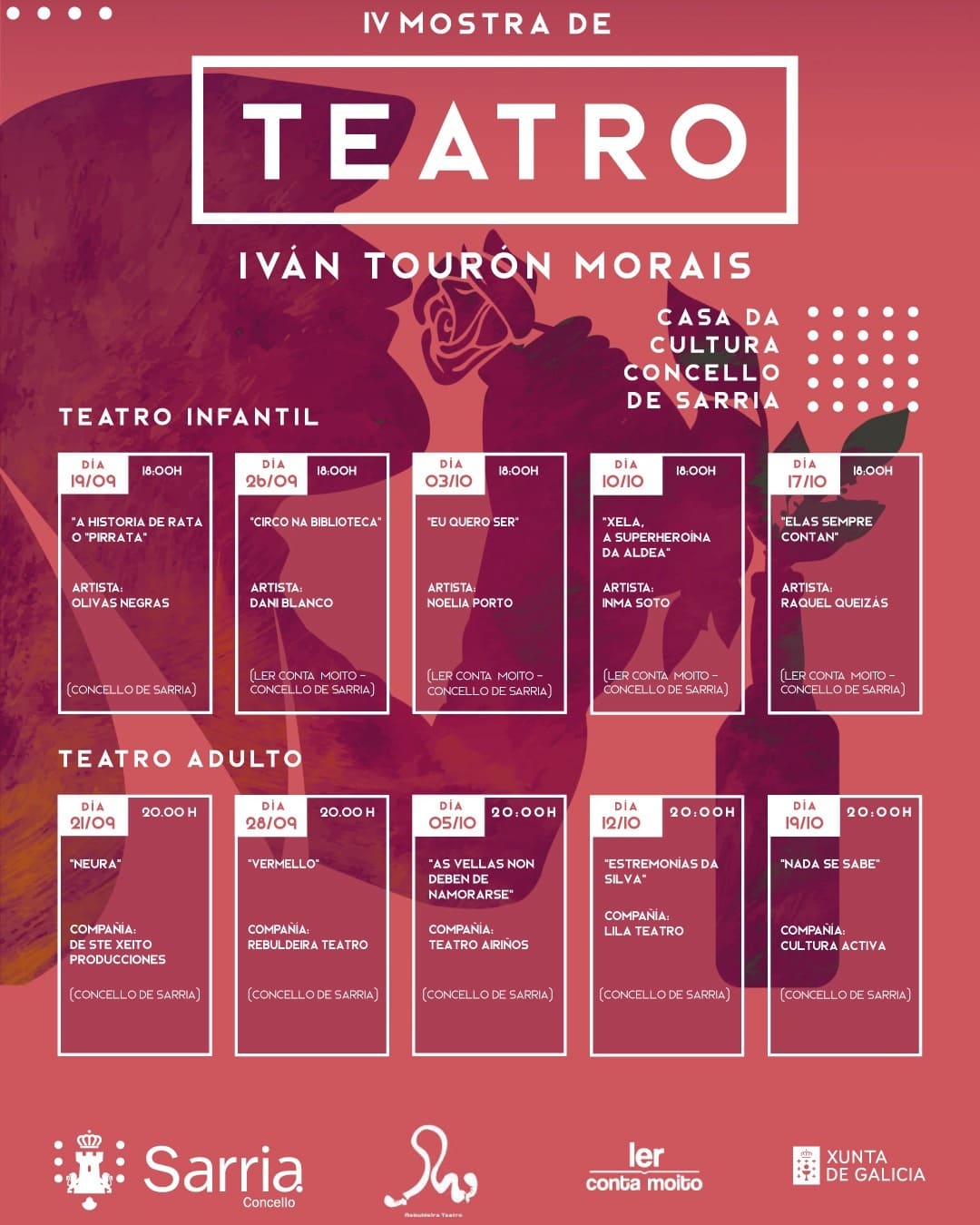 Entre o 19 de setembro e o 19 de outubro, os venres sesión infantil e os domingos para adultos, a Casa da Cultura de Sarria acollerá 10 representacións teatrais do mais variado. Mención especial ao grupo sarriao Rebuldeira, que representará Vermello o día 28 de setembro.